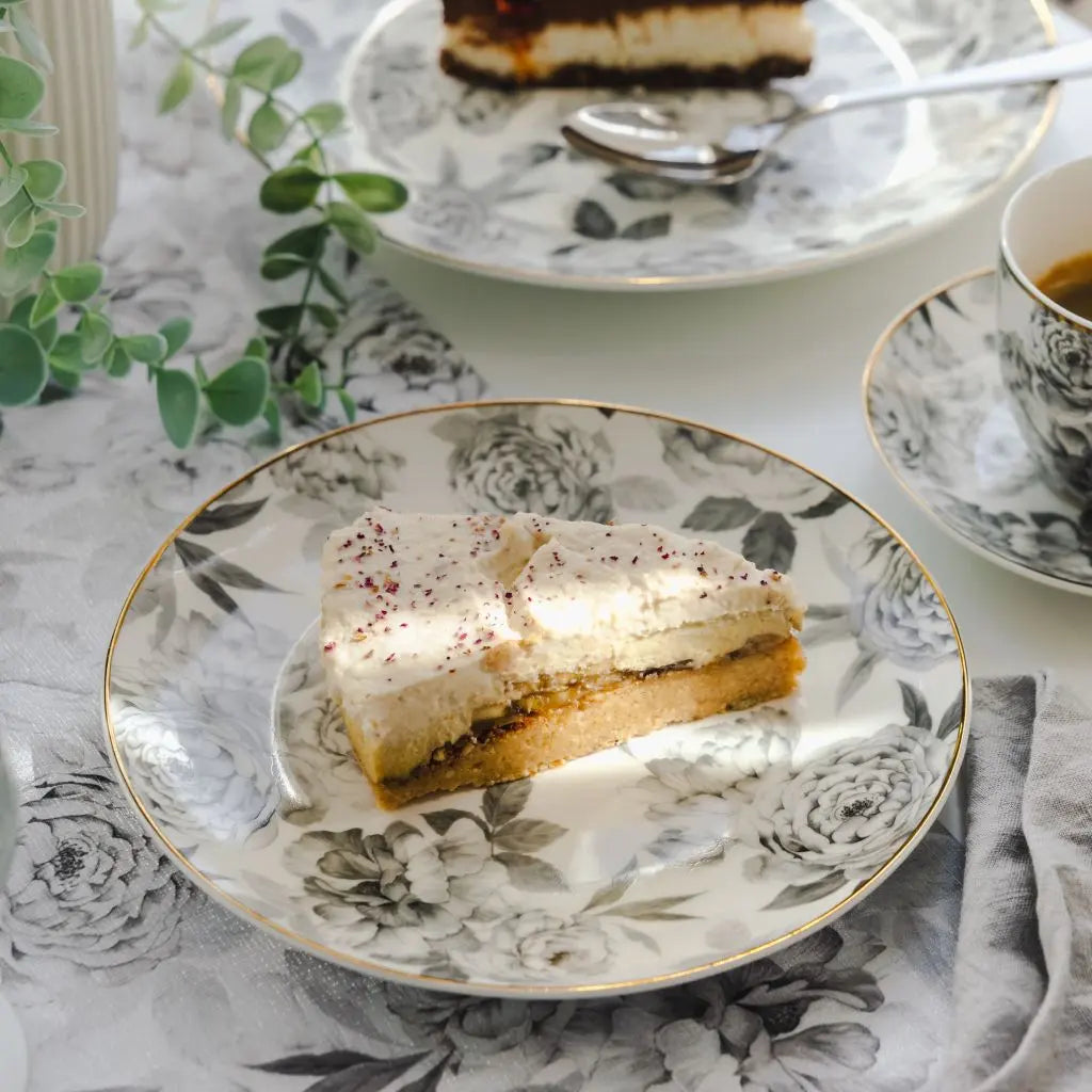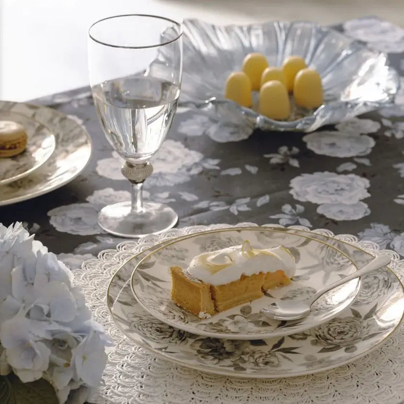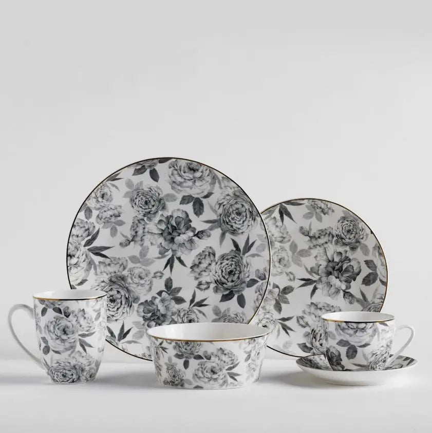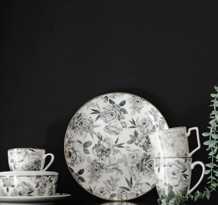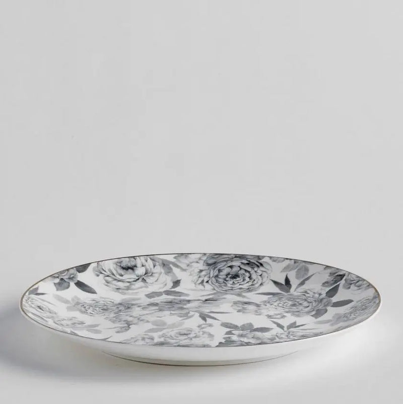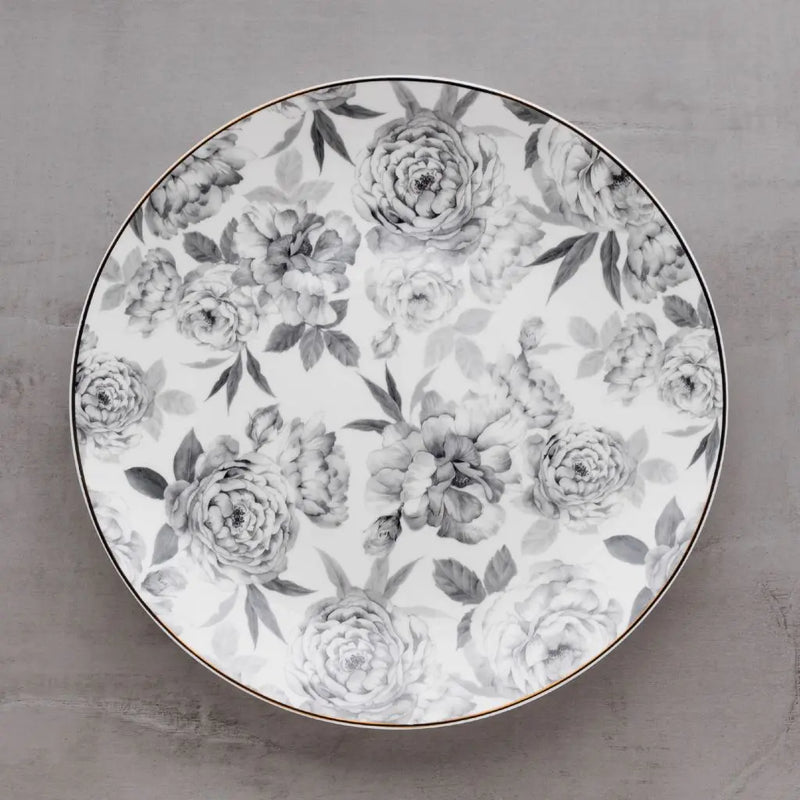 Sivý porcelánový plytký tanier s motívom sivého kvetu a zlatým okrajom. Ideálny na slávnostné obedy aj bežné príležitosti. Na prestretom stole bude vyzerať naozaj krásne. Vytvorí príjemný dojem zo stolovania.