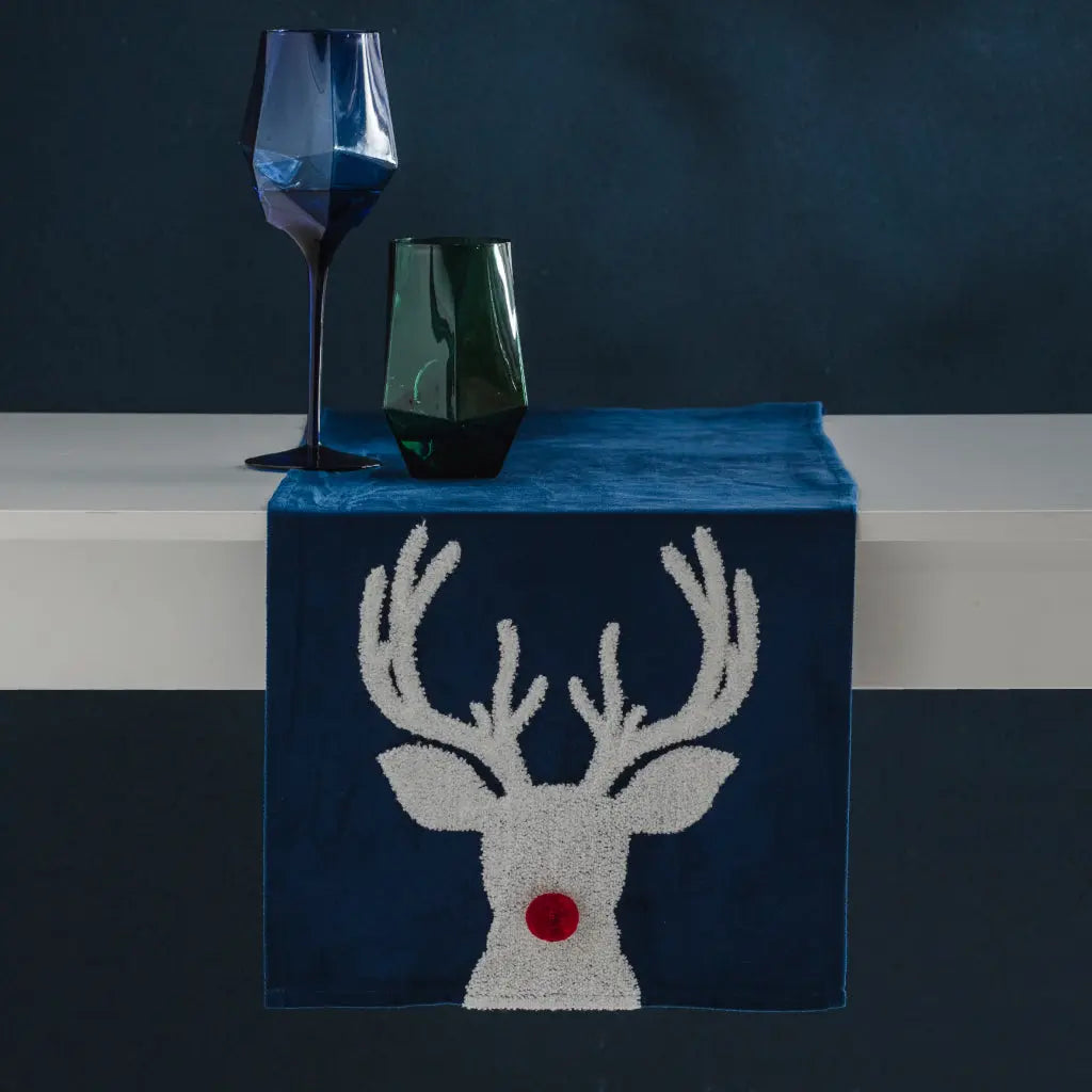 Celkový Vzhľad: Vďaka tmavomodrej farbe a bielemu motívu pôsobí behúň moderne a elegantne, no vďaka motívu Rudolfa si zachováva aj veselý vianočný charakter.