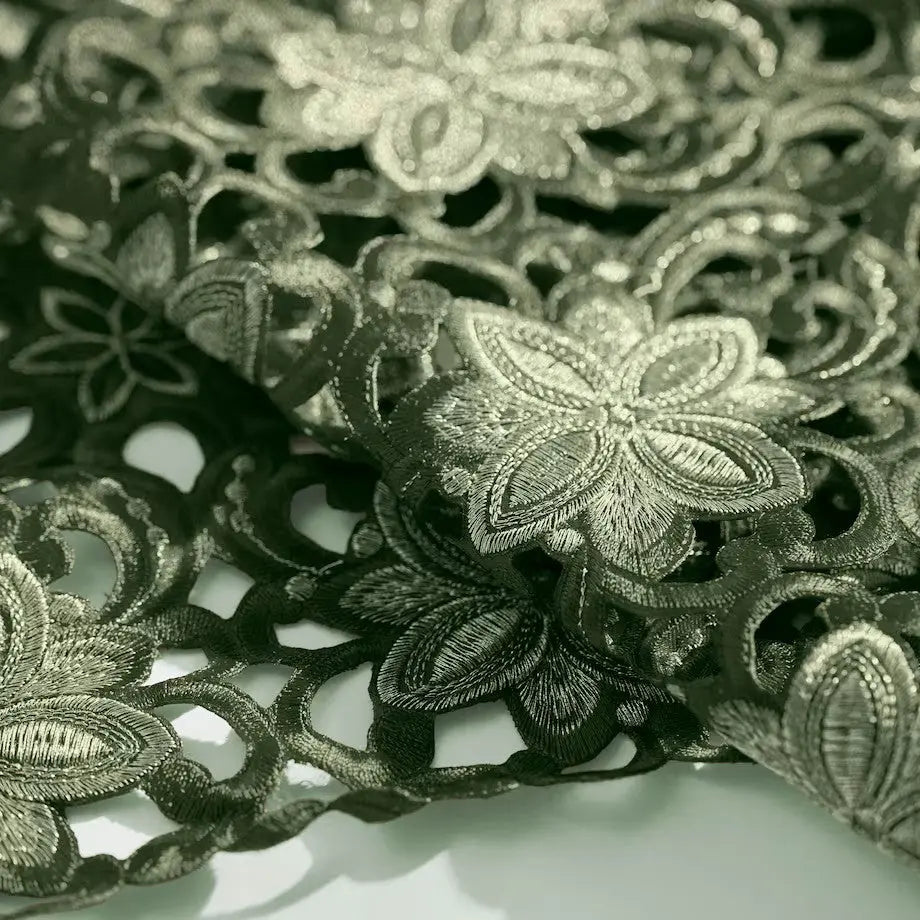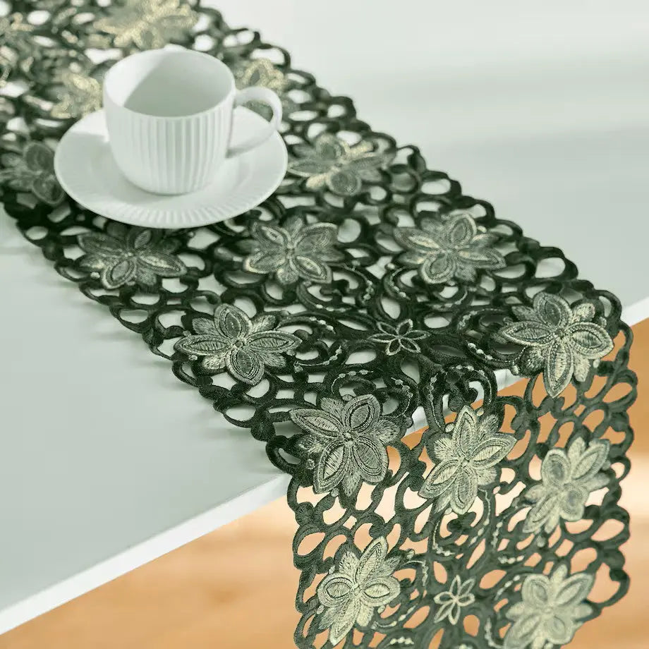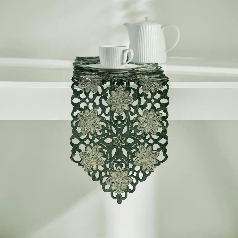 Hlboká tmavozelená farba a otvorený, kvetinový motív s vyrezanými kontúrami listov a kvetov robia z recorového behúňa dokonale zapadajúceho do elegantných, klasických aj moderných aranžmánov. Presný povrch dodáva každému stolu jemnú ľahkosť a luxusný charakter – od slávnostných hostín až po každodenné stretnutia s blízkymi. Je to tiež nápad na praktický darček, ktorý osloví milovníkov krásnych a funkčných domácich doplnkov.