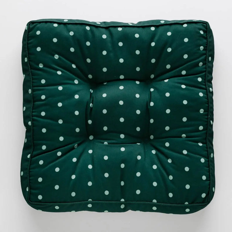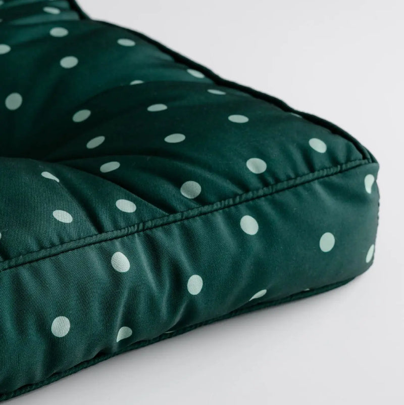 Zelený bodkovaný podsedák. Je mäkký, príjemný na dotyk a v chladnejšom období spríjemní sedenie na studenej stoličke. Zvýši komfort sedenia v domácnosti alebo na záhrade.