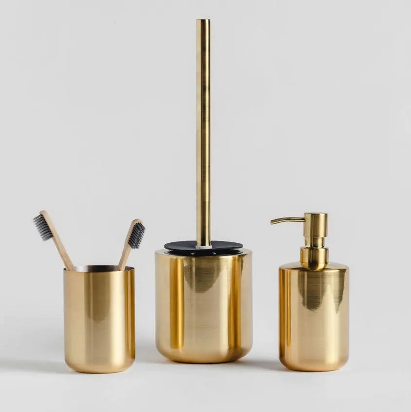 Zlatý kovový kúpeľňový pohár. Dokonalý doplnok k dizajnu interiéru vašej kúpeľne. Poskytuje pohodlie a hygienu pri každodenných činnostiach v kúpeľni. Ideálny na odkladanie zubných kefiek a zubnej pasty.