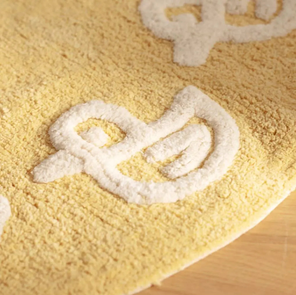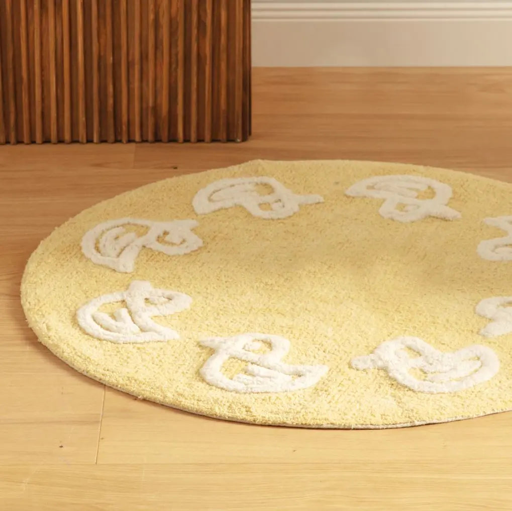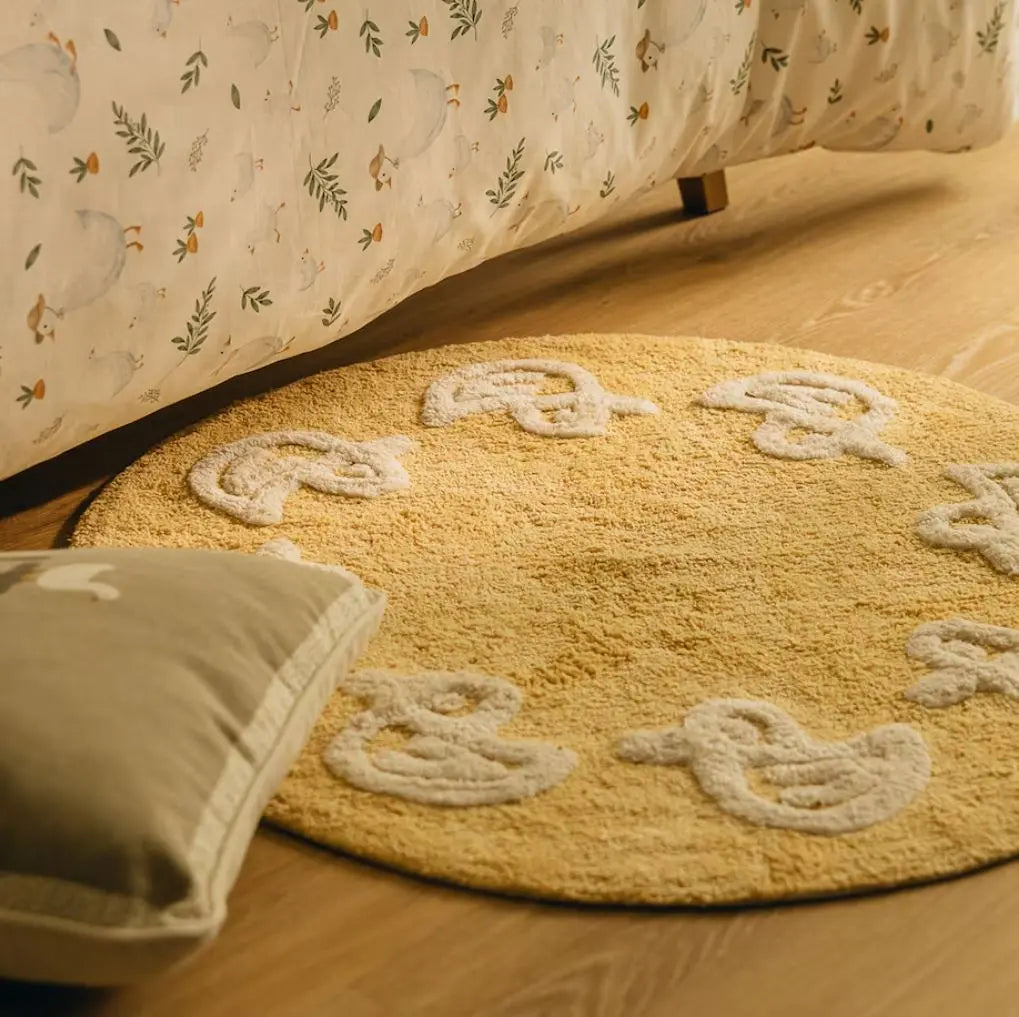 Žltý detský koberec. Tento očarujúci okrúhly detský koberec v žltej farbe je dokonalým doplnkom do detskej izby. Vyrobený z mäkkej bavlny s polyesterom, je nielen príjemný na dotyk, ale aj odolný a nenáročný na údržbu. Na jeho povrchu sú očarujúce kačacie vzory, ktoré dodajú interiéru prvok zábavy a radosti. Žltá farba koberca oživí každú miestnosť, dodá jej teplý a útulný charakter. Skvele sa bude hodiť do detskej izby, stane sa obľúbeným miestom na hranie, oddych a snívanie.